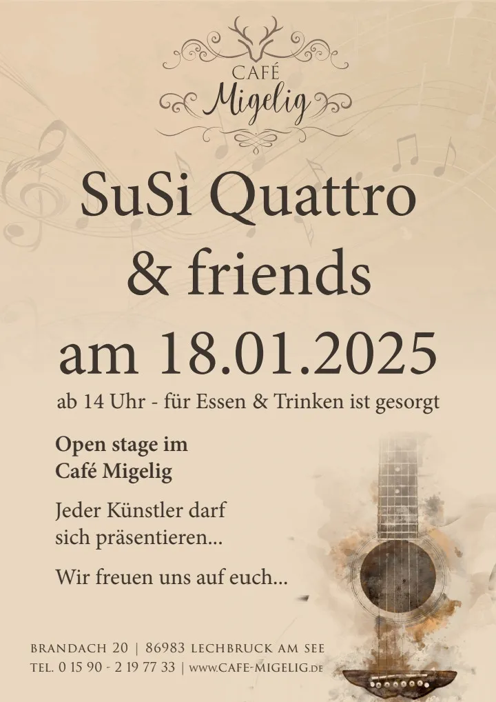 Am 18. Januar 2025 lädt das Café Migelig in Lechbruck am See zu einem besonderen Unplugged-Nachmittag mit SuSi Quattro & Friends ein. Ein Tag voller Musik, Kreativität und Leidenschaft erwartet die Besucher – egal ob zum Zuhören oder Mitmachen!