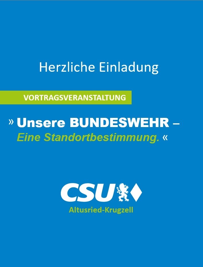 Die sicherheitspolitische Lage in Europa hat sich seit dem russischen Angriff auf die Ukraine grundlegend verändert. Fragen der Landes- und Bündnisverteidigung stehen heute wieder im Mittelpunkt der öffentlichen Diskussion – nach Jahren, in denen die Bundeswehr vor allem mit internationalen Einsätzen und Stabilisierung im Ausland befasst war. Vor diesem Hintergrund lädt der CSU-Ortsverband Altusried-Krugzell zu einer öffentlichen Vortragsveranstaltung mit dem Titel „Unsere Bundeswehr – Eine Standortbestimmung“ ein.