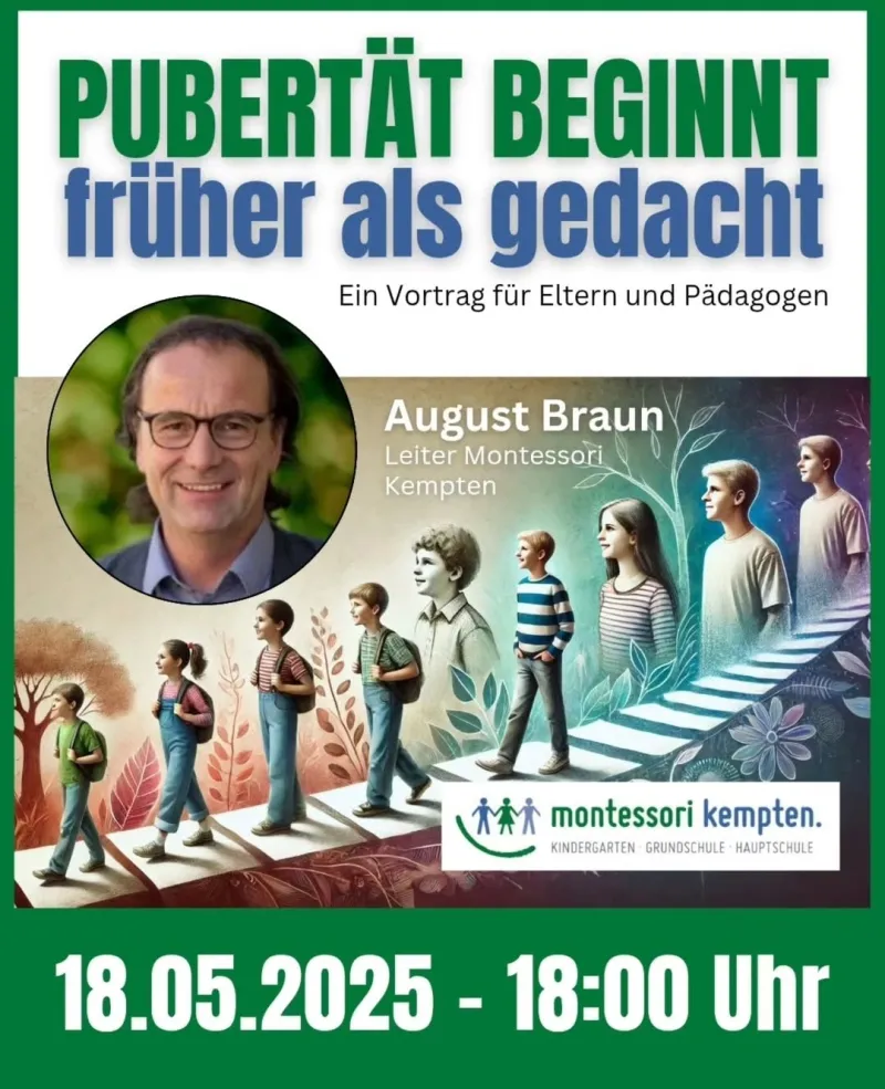 Am 18. Mai 2025 um 18:00 Uhr lädt die Montessori-Schule Kempten zu einem aufschlussreichen Vortrag ein, der sich einem Thema widmet, das Eltern und Pädagogen gleichermaßen bewegt: dem frühen Einsetzen der Pubertät. Unter dem Titel „Pubertät beginnt früher als gedacht“ gibt August Braun, Leiter der Montessori Kempten, Einblicke in aktuelle wissenschaftliche Erkenntnisse und praktische Erfahrungen aus dem Schulalltag.