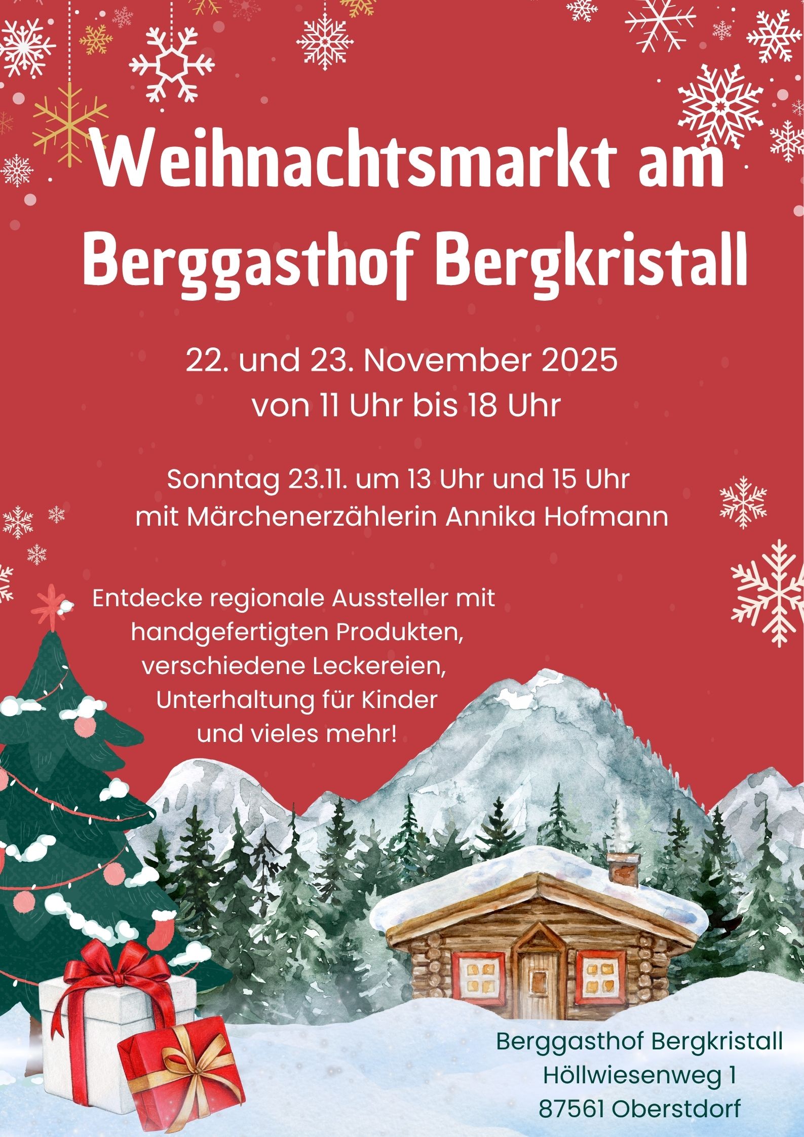 Ein zauberhafter Start in die Adventszeit erwartet Besucherinnen und Besucher am 22. und 23. November 2025 beim stimmungsvollen Weihnachtsmarkt am Berggasthof Bergkristall in Oberstdorf.