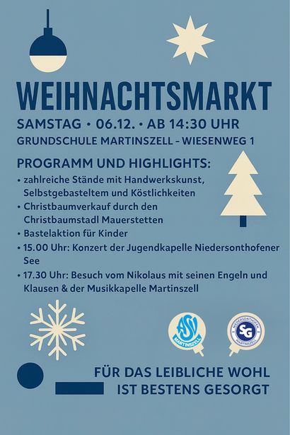Wenn sich der Duft von Tannengrün, frischem Gebäck und warmem Punsch in der Winterluft mischt, verwandelt sich das Gelände der Grundschule Martinszell in einen festlichen Treffpunkt für alle Generationen. Am Samstag, den 6. Dezember, lädt der Weihnachtsmarkt an der Grundschule Martinszell ab 14:30 Uhr zu einem stimmungsvollen Nachmittag mit traditionellem Flair, regionalem Handwerk und musikalischen Akzenten ein. 🎄✨