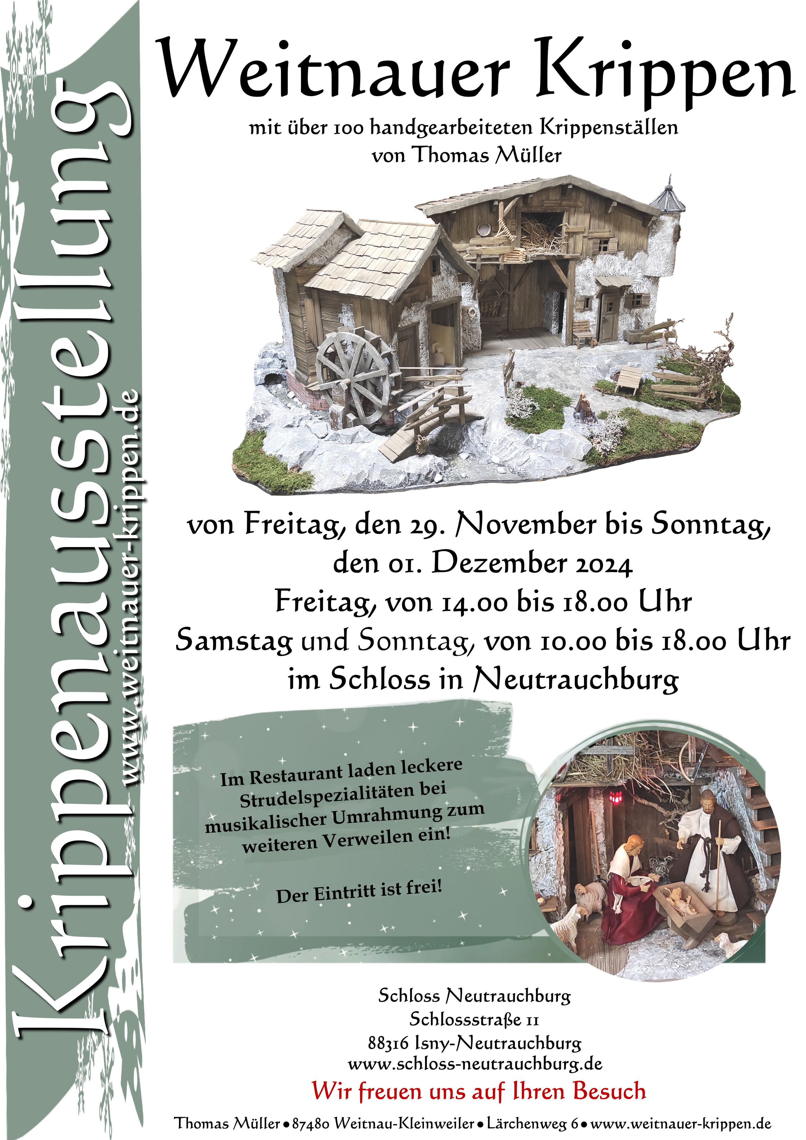 Vom 29. November bis 1. Dezember 2024 wird die "Weitnauer Krippenausstellung" in den historischen Räumlichkeiten des Schlosses Neutrauchburg veranstaltet. Inmitten barocker Eleganz zeigt der passionierte Krippenbauer Thomas Müller über 100 detailreich gestaltete Krippenställe, die von orientalischen bis hin zu alpenländischen Designs reichen.