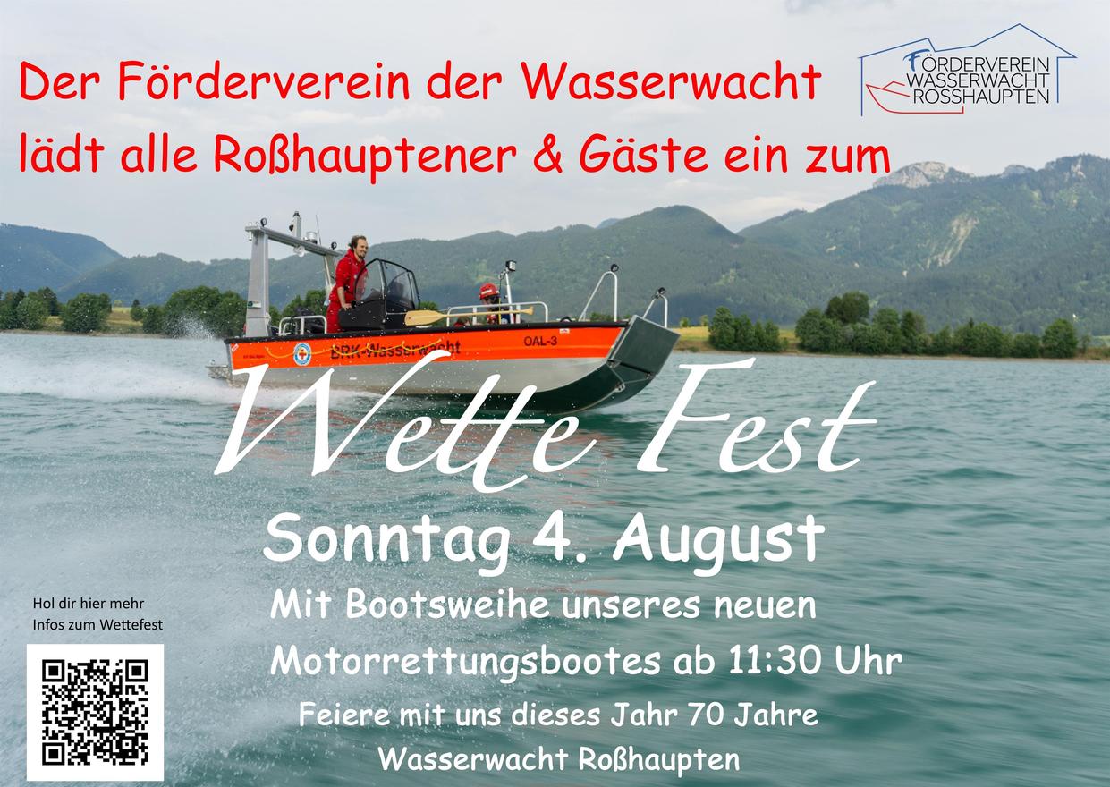 Der Förderverein der Wasserwacht Roßhaupten lädt alle Roßhauptener und Gäste herzlich zum Wettefest ein. Diese besondere Veranstaltung findet am Sonntag, den 4. August 2024, ab 11:30 Uhr im Stoager's Naturbad Wette statt. Das Fest markiert einen bedeutsamen Moment für die Wasserwacht, da das neue Motorrettungsboot feierlich eingeweiht wird. Die Bootsweihe beginnt um 11:30 Uhr und wird durch eine Segnung um 12:00 Uhr offiziell abgeschlossen.
