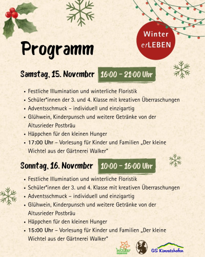 Im Mittelpunkt steht die winterliche Ausstellung, in der das Team der Gärtnerei Walker seine florale Gestaltungskunst zeigt: Adventskränze, Naturmaterialien und detailreiche Gestecke prägen das Bild. Ergänzt wird die Schau durch kulinarische Angebote – Glühwein, Kinderpunsch und herzhafte Kleinigkeiten sorgen für Wärme von innen. Die Getränke stammen von der Altusrieder Postbräu, das gastronomische Angebot richtet sich an große und kleine Gäste gleichermaßen. 🍷🥨🧃